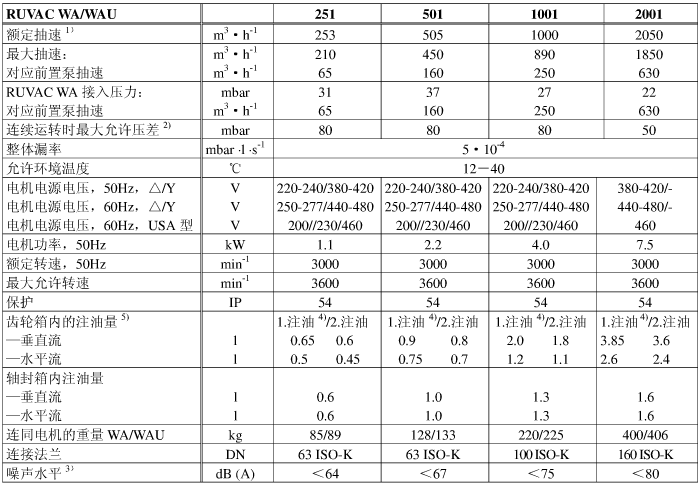在250~2050米3/小时的抽速范围内,欧瑞康莱宝的罗茨泵的电机有直联式(WA/WAU)和封闭式(WS/WSU)两种规格,每种规格又分为带逸流阀、可在大气下启动的WAU/WSU和不带逸流阀的WA/WS的两种形式。